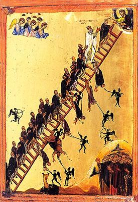 Η Ουρανοδρόμος Κλίμαξ. Εικόνα του 12ου αιώνα από την Μονή του Σινά. Βλέπουμε ανθρώπους να προσπαθούν να ανέβουν την σκάλα των αρετών προς τον Θεό, ενώ οι δαίμονες με τα πάθη προσπαθούν να τους τραβήξουν κάτω και σε ορισμένες περιπτώσεις το καταφέρνουν.