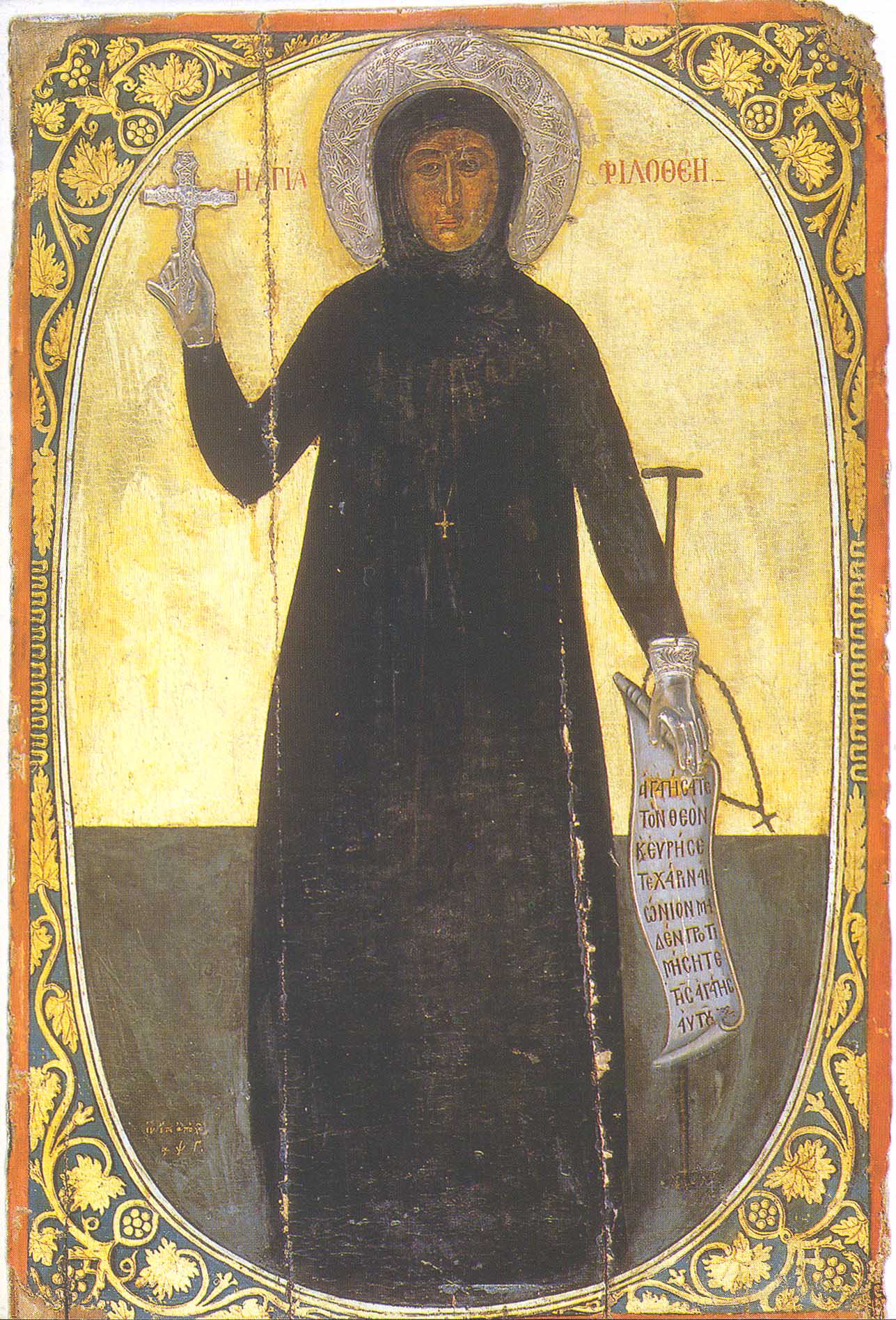 Η αγία Φιλοθέη σε εικόνα του 1703. Στο ειλητάριο που κρατάει διαβάζουμε: "Αγαπήσατε τον Θεόν και ευρήσετε χάριν αιώνιον, μηδέν προτιμήσητε της αγάπης αυτού." (Αγαπήστε τον Θεό και θα βρείτε Χάρη αιώνια, τίποτα μην προτιμήσετε από την αγάπη Του.)