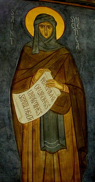 Our holy mother Syncletica was born at Alexandria in the course of the fourth century to rich and devout parents, who came originally from Macedonia. From her youth, she had been seen as an excellent match on account of her great beauty, intelligence and virtues, and she had many suitors; but she remained deaf and blind to every worldly attraction, for she aspired only to spiritual marriage to Christ, the heavenly Bridegroom. Bringing her flesh into subjection by fasting and austerities of every kind, she constantly gathered her spirit in the depths of her heart and cried out night and day: My Beloved is mine, and I am His (Song of Songs 2:16).