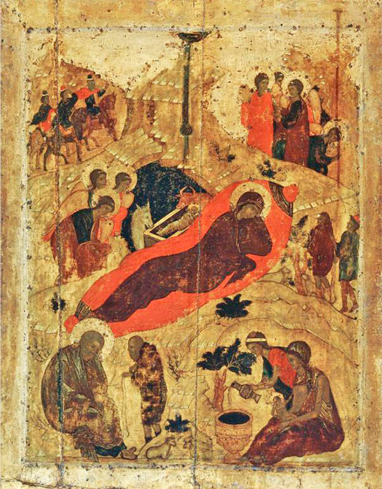 Ανάμεσα στα πρώιμα έργα του Ρουμπλιόφ είναι “Η Γέννηση του Χριστού’, στον καθεδρικό ναό του Ευαγγελισμού της Θεοτόκου στη Μόσχα. Λάτρης του ζωντανού χρώματος μέσα σε μια φωτισμένη ατμόσφαιρα, ο δημιουργός του έργου “Η Γέννηση του Χριστού” δεν βλέπει τις μορφές και τις σιλουέτες ως επίπεδες κηλίδες, αλλά μάλλον, ως φωτεινή παρουσία από το μέλλον, σε αχανή χώρο. Τα πάντα φαίνεται πως είναι περιβεβλημένα με σημασία, αλλά και μεγάλη ελευθερία, τόσο χωρική όσο και πνευματική. / Η Γέννηση του Χριστού, 1405.