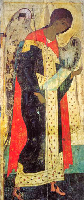 Η ζωγραφική στη Δέηση του Ζβενίγκοροντ ξεχωρίζει για τη μοναδική καθαρότητα του χρώματος, την αρχοντιά των τονικών μεταβάσεων και τη φωτεινότητα των χρωμάτων. Φως ακτινοβολεί από το χρυσό φόντο και μέσα από την ευγενική ανάδυση φωτεινών προσώπων, τις καθαρές αποχρώσεις της ώχρας, του μπλε, ροζ και από τις πράσινες αποχρώσεις των ρούχων. Στην εικόνα του Αρχαγγέλου Μιχαήλ, ο Ρουμπλιόφ δόξασε την ήσυχη, λυρική ενατένιση του ποιητή. / Ο Αρχάγγελος Μιχαήλ, 1408.