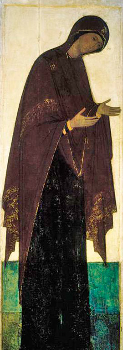 Στη Δέηση του Ρουμπλιόφ στον Καθεδρικό Ναό Κοιμήσεως, υπάρχει η απεικόνιση της νεαρής Παναγίας ντυμένης με σκούρα χρώματα που είναι ασυνήθιστα μινιμαλιστική, αλλά κατακτά με την αυστηρή, αρχοντική ομορφιά της. Οι βυζαντινοί καλλιτέχνες ζωγράφιζαν την Παναγία με διαφορετικό τρόπο, εκφράζοντας μια τραγική αρχή στην απεικόνισή της, όπου η Παρθένος δεν είναι τόσο νέα όπως του Ρουμπλιόφ και απεικονίζεται με βαρείς τόνους. Οι Ρώσοι καλλιτέχνες προσπαθούν να ανακινήσουν φωτεινά, χαρούμενα συναισθήματα στον θεατή. / Η Παναγία, 1408.