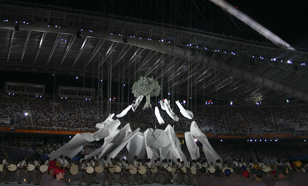 Στιγμιότυπο από την εντυπωσιακή τελετή έναρξης των Ολυμπιακών Αγώνων του 2004, στην Αθήνα, στο ΟΑΚΑ (Φωτ.: Νίκος Λουπάκης)