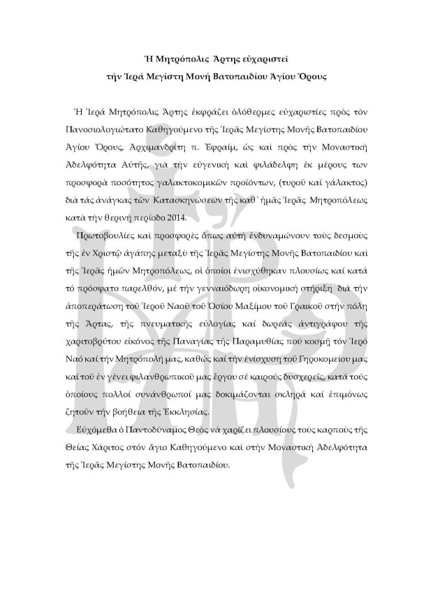 Η Ιερά Μητρόπολις Άρτης ευχαριστεί την Ιερά Μεγίστη Μονή Βατοπαιδίου