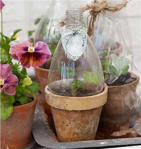 Με μια μικρή και έξυπνη συμβουλή μπορείτε να προστατέψετε τα μικρά φυτά που έχετε στο σπίτι σας από το κρύο και την παγωνιά!Αρχικά κόβουμε μερικά πλαστικά μπουκάλια από νερό ή κάποιο αναψυκτικό λίγο πιο πάνω από τη μέση. Αν θέλετε τοποθετείτε και κορδελίτσα για στόλισμα. Αφού ξεβιδώσετε τα καπάκια τους, σκεπάστε τα γλαστράκια με τα κομμένα μπουκάλια.