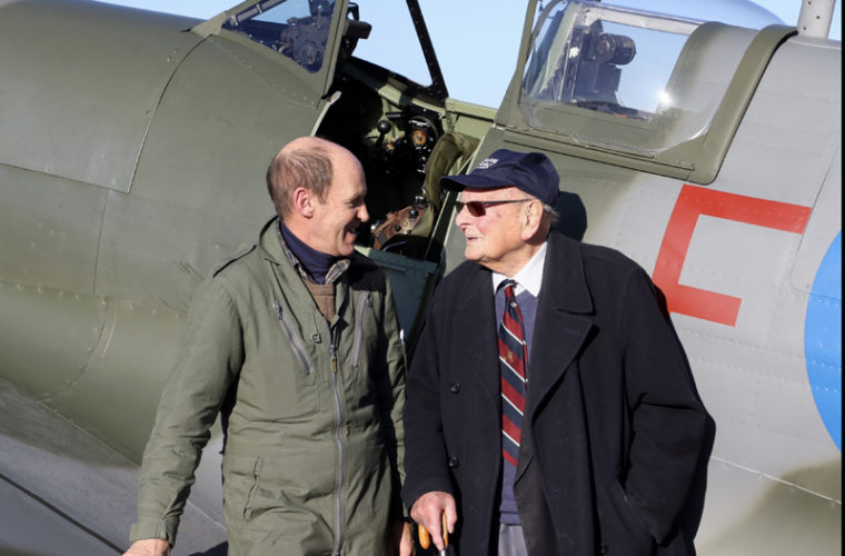 Φωτογραφία που δόθηκε σήμερα στην δημοσιότητα μέσω του Ιδρύματος “ΙΚΑΡΟΣ” και απεικονίζει τον Βρετανό πιλότο Τζορτζ Νταν (δεξιά) μπροστά στο ελληνικό “Σπιτφάιρ” MJ755, που ανακατασκευάστηκε πρόσφατα σε πτητική κατάσταση, και αποτελεί ιστορικό αεροσκάφος της Πολεμικής Αεροπορίας. Ο βετεράνος αεροπόρος, που είχε παραδώσει το αεροπλάνο στην Αθήνα το 1947, μίλησε για την ζωή του στο ΑΜΠΕ. ΑΠΕ ΜΠΕ/ΙΔΡΥΜΑ ΒΡΕΤΑΝΙΚΗΣ ΑΕΡΟΠΟΡΙΑΣ/STR