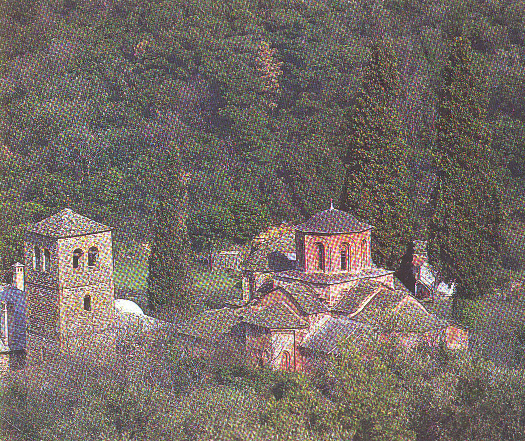 La première est bâtie à distance d’environ une demi-heure de marche du Monastère, vers le Sud-ouest, à l’emplacement où, auparavant, se trouvait le petit Monastère de Chalkeus, cité dès le Xème siècle. D’après la tradition, elle a été construite par des parents de saint Dimitri de Salonique. La seule chose qui en ait été conservée, c’est le pavement avec marbres incrustés du kyriakon (église centrale d’une skite), œuvre du XIIème siècle. Elle ne s’organise en tant que skite qu’à partir du XVIIIème siècle, époque à laquelle a été rédigé son premier Typicon (Règlement, en 1729). Les peintures murales qui ornent l’intérieur du kyriakon datent de 1755, celles du narthex extérieur, fondé plus tard (1796) ont été effectuées en 1806. En 1764, a été bâtie l’église du cimetière.