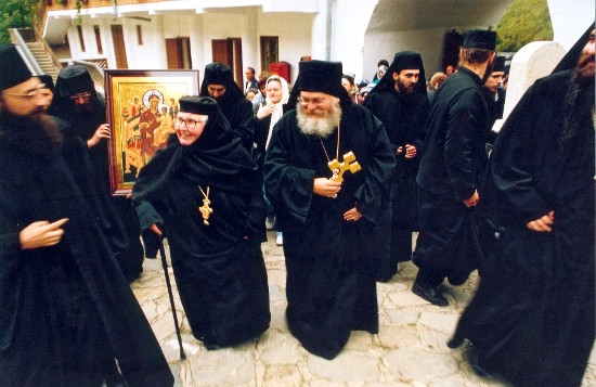 Arhim. Efrem: Noi cu multă bucurie am venit pentru a doua oară în mănăstirea sfinţiei voastre, stimată Maică Stareţă, mai ales că de data asta v-am adus icoana Maicii Domnului Pantanassa, a cărei trecere pe aici eu cred că nu este întâmplătoare, ci este o dovadă a faptului că mănăstirea sfinţiei voastre este plăcută Maicii Domnului. Prin prezenţa ei aici, Maica Domnului dovedeşte că vă poartă de grijă, că vă acoperă, că vă urmăreşte şi că este alături de voi, pentru că deşi este Maica lumii întregi, Maicii Domnului îi plac mănăstirile şi se mângâie atunci când sălăşluieşte în mănăstiri. De aceea, cele mai multe icoane făcătoare de minuni ale Maicii Domnului sunt păstrate la mănăstiri. Iar Maica Domnului, atunci când se arată în vedenie, se arată de multe ori ca monahie.