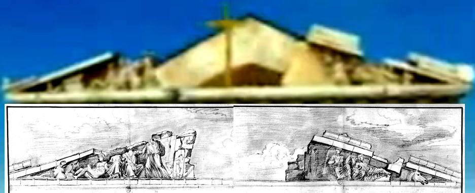 «Το ανατολικό αέτωμα του Παρθενώνα κατά το 500 μ.Χ. όπως το παρουσιάζει το βίντεο του Κώστα Γαβρά, σε αντιπαραβολή με τα σχέδια που έκανε ο Φλαμανδός Jacques Karrey το… 1674 μ.Χ. Ερωτήματα που προκύπτουν: πώς είναι δυνατόν η καταστροφή το 500 μ.Χ. να είναι ΜΕΓΑΛΥΤΕΡΗ απ’ ότι το 1674 μ.Χ., 1174 χρόνια μετά; Και ποιος στην ευχή ανέβασε πάλι πίσω στη θέση του το κομμάτι που… έλειπε το 500 μ.Χ.;»