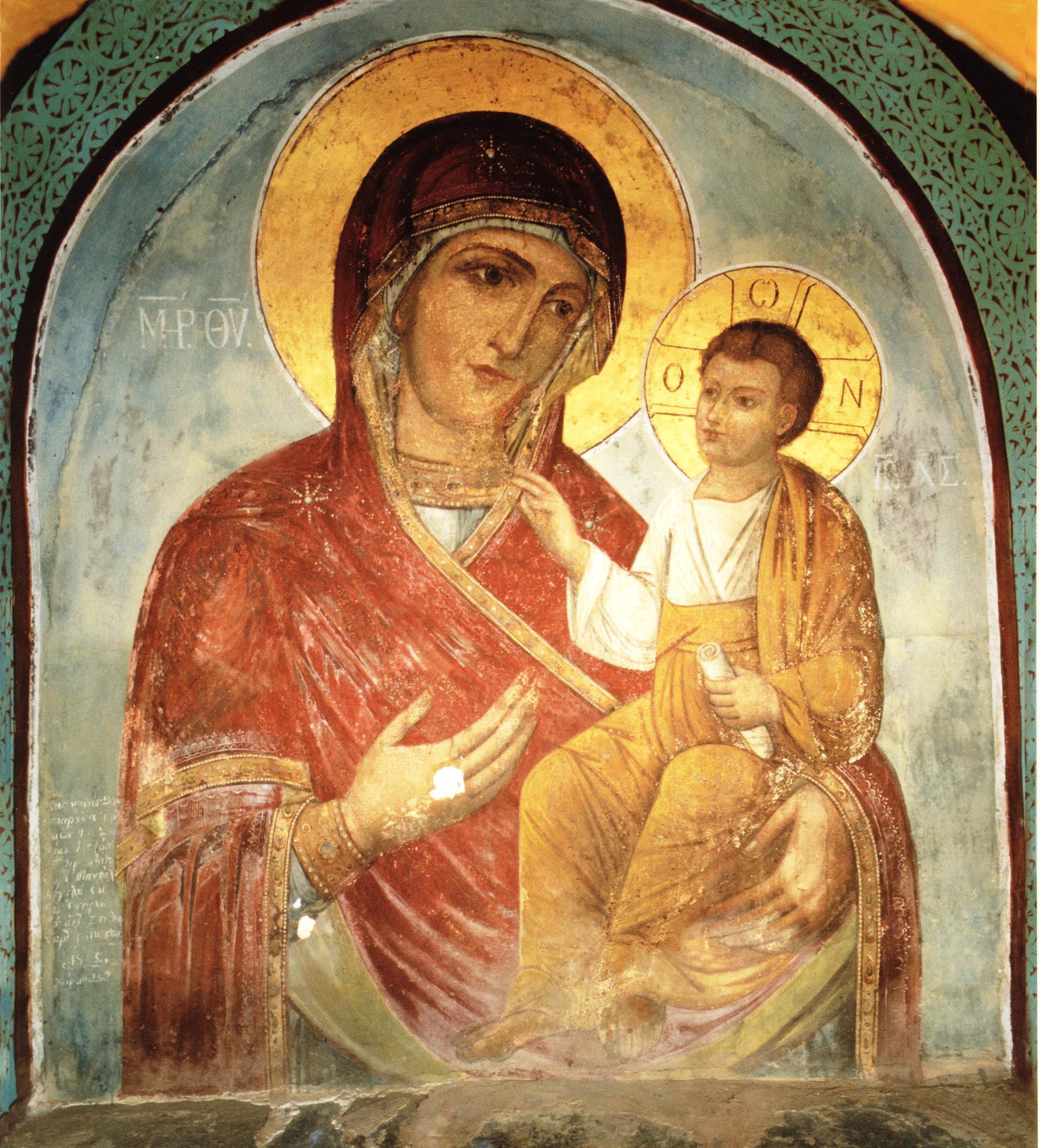 J’entrai dans le monastère à midi en passant par une lourde double porte en bois toute cloutée. Au dessus de moi, dans un coffret en verre, une Icône de la bienheureuse Vierge appelée la “Pyrovolitisa.” Comme je l’apprendrai par la suite, l’Icône tient son nom du fait qu’un soldat turc lui avait tiré dessus (“pyrovolo” – tirer) en 1822; la balle avait troué la main droite de la Vierge. Suite à cela, le soldat devint fou, et se pendit à un olivier en dehors du monastère. Cette Icône est une des nombreuses Icônes locales de la sainte Vierge; chacune a sa propre histoire, inspirante, et des événements miraculeux qui lui sont associés.