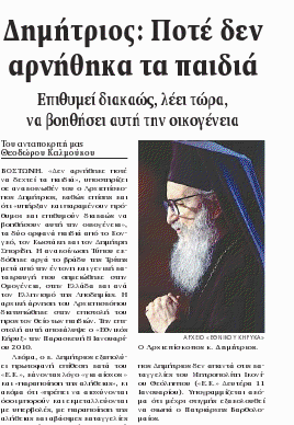 Μπόρεσε να εορτάσει ως αρχιερεύς τις Αγιες αυτές ημέρες άνευ συνειδησιακού προβλήματος; Πώς μπόρεσε να δώσει την απάντηση που έστειλε εις τον θείο των δύο αυτών παιδιών και μάλιστα κοροϊδεύοντας και στέλνοντας ευχάς ‘διά εξεύρεσιν λύσεως’. Αλήθεια πού βαδίζουμε; Πού οδηγείται αυτή η ταλαίπωρος Ορθόδοξος Εκκλησία; Πού την οδηγούν οι ασυνείδητοι ποιμένες της; Πώς θέλουμε να μας πιστεύει ο κόσμος και να μας ακολουθεί όταν εμείς άλλα κηρύττουμε και άλλα πράττομε; Λυπάμαι πολύ διά τον Αρχιεπίσκοπο Δημήτριο, με απογοήτευσε δια μίαν ακόμη φορά.