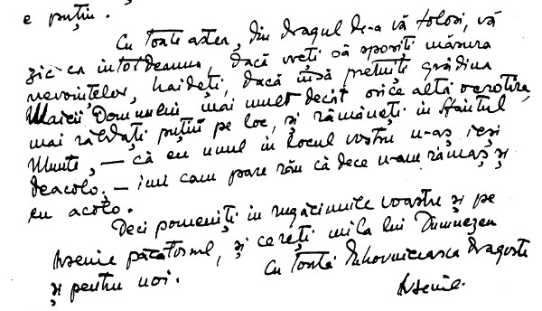 6. Stareţul, – cum ştiţi, e Vlădica; vine când poate, şi împarte ascultările şi blagosloveniile. Cât propriuzis pe duhovnic aruncăm mântuirea sufletului. Cu toate astea, e un Stareţ bun, blând, cu mare dragoste de Mănăstire, şi câte alte bune, de s’a umplut o carte de vreo 1000 de pagini cu ele.