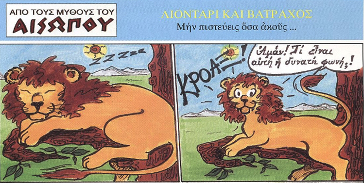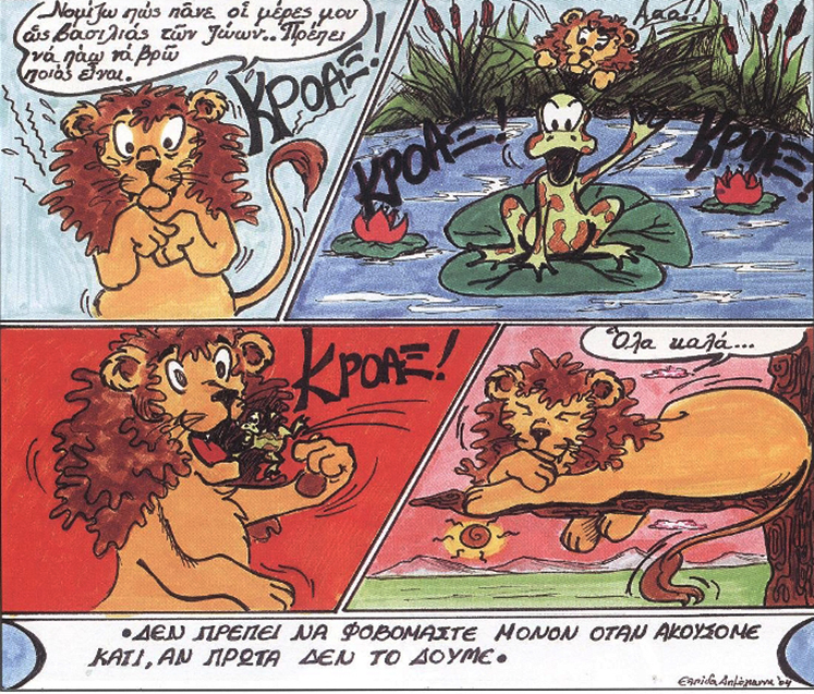 Μύθοι του Αισώπου: «Λιοντάρι και βάτραχος» 16 Απριλίου 2010 Εικονογράφηση: Ελπίδα Δημόγιαννη Tags:ΑίσωποςβάτραχοςΕλπίδα Δημόγιαννηλιοντάριμύθοι