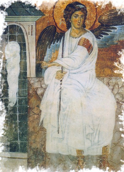 «Και όταν μπήκαν στο μνήμα, είδαν ένα νέο με λευκή στολή να κάθεται στα δεξιά, και τις κατέλαβε φόβος και έκπληξη». Όταν είδαν οι γυναίκες την πέτρα μετατοπισμένη από το ζωηφόρο μνήμα, μπαίνουν αμέσως προς τα μέσα· και όταν αντίκρισαν ένα απροσδόκητο θέαμα που τις έφερε σε αμηχανία, τις κατέλαβε τρόμος και έκπληξη, γιατί είδαν ένα λευκοφορεμένο νέο στα δεξιά του τάφου και σάστισαν από την εκπληκτική μορφή του. Σημαίνει δε «θάμβος» κάποιο φόβο που προκαλείται από ένα ασυνήθιστο θέαμα. Το ότι ο άγγελος παρουσιάστηκε στα δεξιά του τάφου, ήταν ενδεικτικό ενός αίσιου γεγονότος και μηνύματος. Κατά τον ίδιο τρόπο και ο Γαβριήλ, όταν αναγγέλλει στο Ζαχαρία την ευχάριστη είδηση της γεννήσεως του Προδρόμου, παρουσιάζεται στο δεξιό μέρος του θυσιαστηρίου. Όσον αφορά στο λευκό χρώμα της στολής του αγγέλου, αυτό φανερώνει τη λαμπρή και ολοφώτεινη ανάσταση. Η δε νεανικότητα της αγγελικής μορφής φανέρωνε ότι η μορφή των αγγέλων βρίσκεται πάντοτε και με τον ίδιο τρόπο στην άνθισή της. Γιατί τα θεία τα χαρακτηρίζει πάντοτε η νεανικότητα, μια και δεν συμμετέχουν στη διαδικασία της γήρανσης και βιώνουν τη θεϊκή μακαριότητα.[…]