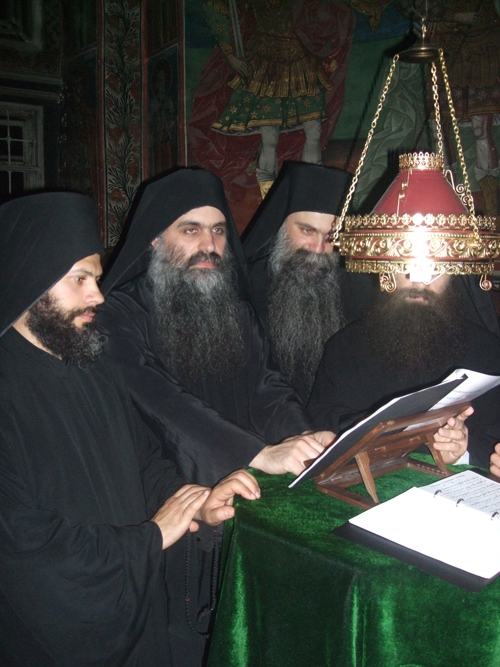 Στην πανήγυρη προσκλήθηκε ομάδα Βατοπαιδινών ψαλτών που έψαλλαν στο δεξιό χορό μαζί με τον Ιερομόναχο Αντίπα τον Καρεώτη, ενώ στον αριστερό χορό έψαλλαν στα σλαβονικά χορωδία από την Βουλγαρία και οι πατέρες της Ιεράς Μονή Ζωγράφου. Μπορείτε να ακούσετε την Καταβασία της ενάτης ωδής «Φωτίζου, φωτίζου…» μαζί με το μεγαλυνάριο «Ο Άγγελος εβόα..» σε μέλος του ιεροδιακόνου Θεοφάνους Βατοπαιδινού όπως τα έψαλλαν οι βατοπαιδινοί πατέρες στην Αρχιερατική Θεία Λειτουργία: O Agelos evoa