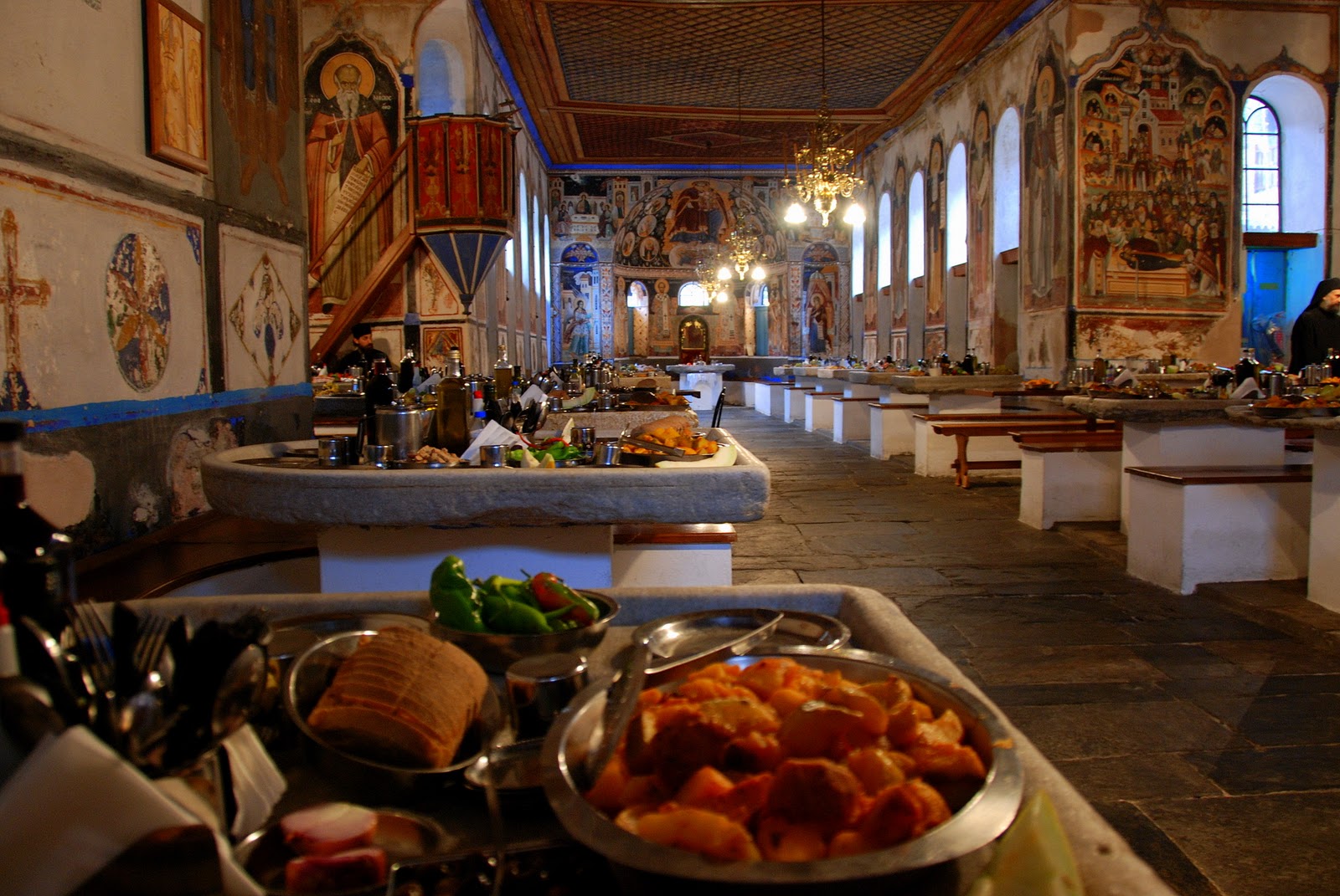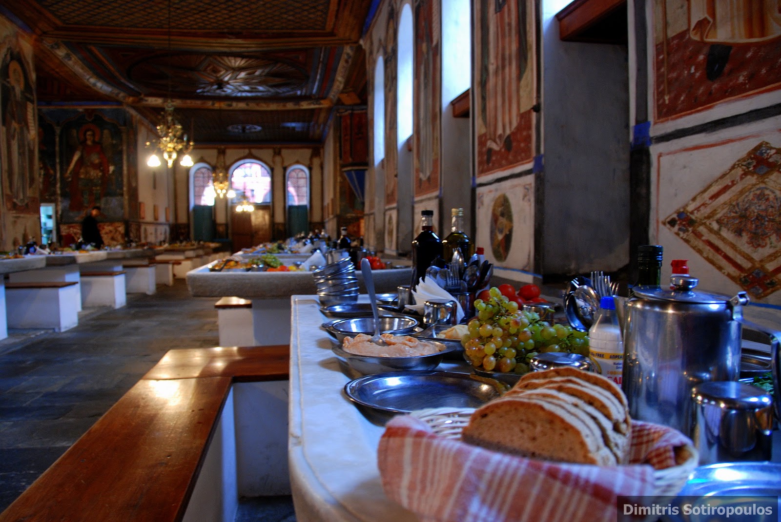 Όσο για τους επισκέπτες,έφταναν μέχρι αργά το απόγευμα,λίγο πριν κλείσει η πόρτα της Μονής:Αυτό αρκεί για να καταδείξει τον αριθμό τους,που ήταν τόσο μεγάλος ώστε να μην επαρκεί η τεράστια Τράπεζα του Βατοπαιδίου,με συνέπεια αρκετοί από αυτούς να φάνε σε διπλανά οικήματα!