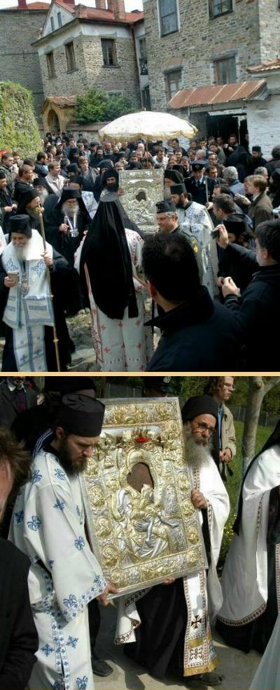 Έξι ολόκληρες ώρες διαρκεί η περιφορά, διάστημα κατά το οποίο οι χαρμόσυνες κωδωνοκρουσίες και οι βυζαντινές μελωδίες πλημμυρίζουν τον ανοιξιάτικο ουρανό. Η λιτανεία περνάει από τα κονάκια και τα κελλιά των μοναχών οι οποίοι υποδέχονται την εικόνα με τιμές και παράλληλα προσφέρουν εδέσματα, τυρί και κρασί για να κεραστούν οι επισκέπτες του Αγίου Όρους.