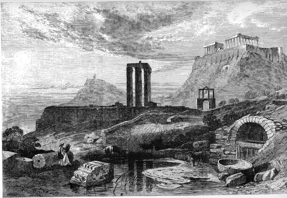 Χαρακτικό από τον ξένο τύπο της εποχής, με την πηγή της Καλλιρόης, τις Στήλες του Ολυμπίου Διός, την Πύλη του Αδριανού και την Ακρόπολη