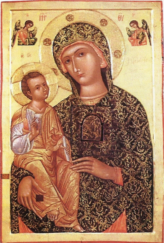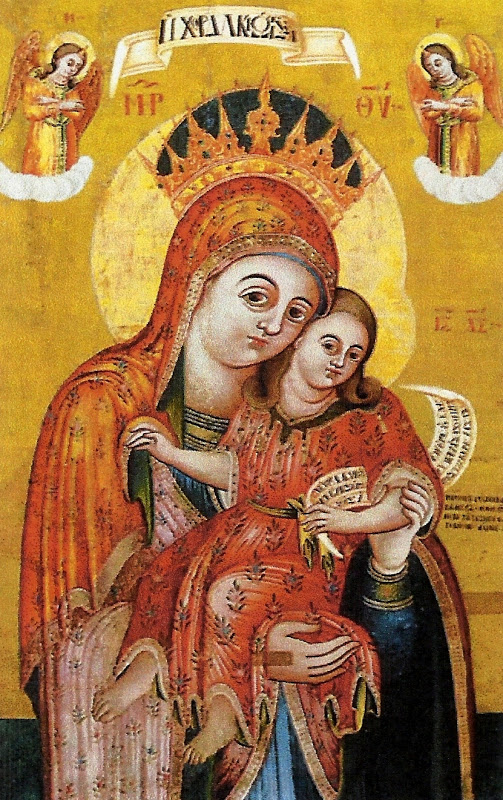 Ο υιός σου Παρθένε, πάτηρ έστι χριστώνυμων απάντων και αδελφός, όθεν συ, πανάρχαντε, αγνή, τούτον γεννήσασσα και γλυκυτάτη μήτηρ ημών τε και έφορος· εν τω όρω τούτω κλήρον απείληφας παρά του υιού σου, εξερέτως υπάρχεις, διο ημάς οίκτιρον ως εκγόνους και τέκνα και ως δούλους σου, Δέσποινα, πρεσβεύουσα τω σω ιυώ και Θεώ των πταισμάτων άφεσιν δωρήσασθαι, ώσπερ εν έργω και νω αμαρτάνομεν.