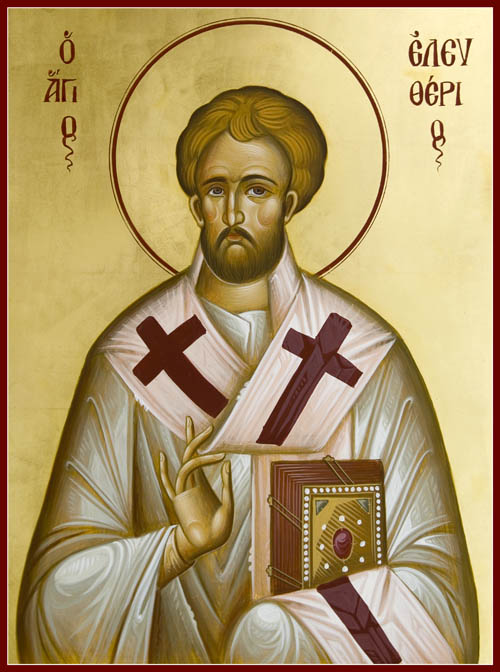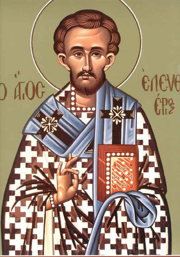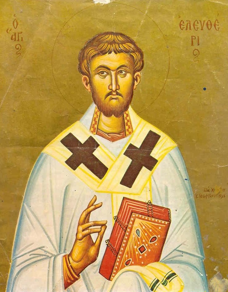 Ἐλεύθερον τὸν νοῦν, ἐκ παθῶν κεκτημένος, ἐγένου τοῦ Θεοῦ, γνησιώτατος δοῦλος, καὶ πλάνης ἠλευθέρωσας, τοὺς καλῶς σοι ποθήσαντας, ἐναθλήσας δέ, ὡς ἱερεύς τε καὶ Μάρτυς, Ἐλευθέριε, διπλοῦν ἐδέξω τὸ στέφος, πρεσβεύων σωθῆναι ἡμᾶς.