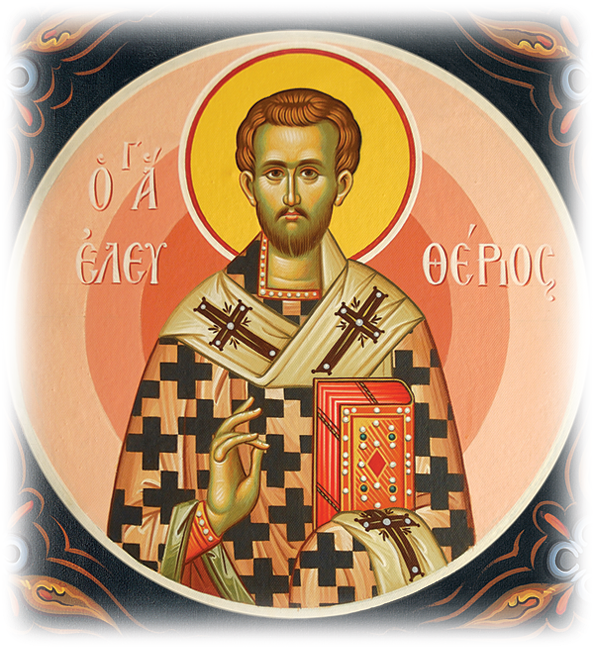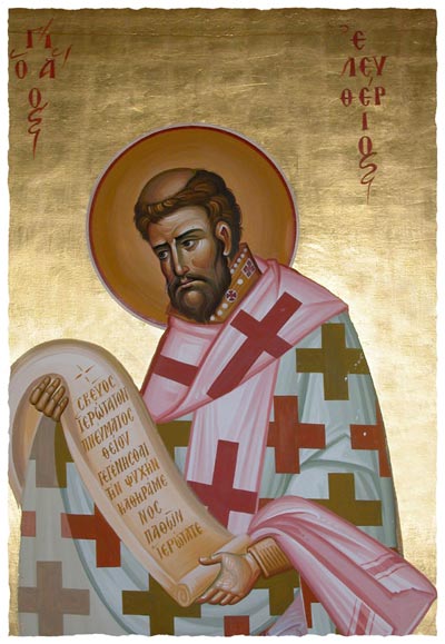 Καὶ τρόπων μέτοχος, καὶ θρόνων διάδοχος, τῶν Ἀποστόλων γενόμενος, τὴν πρᾶξιν εὗρες θεόπνευστε, εἰς θεωρίας ἐπίβασιν· διὰ τοῦτο τὸν λόγον τῆς ἀληθείας ὀρθοτομῶν, καὶ τῇ πίστει ἐνήθλησας μέχρις αἵματος, Ἱερομάρτυς Ἐλευθέριε· Πρέσβευε Χριστῷ τῷ Θεῷ, σωθῆναι τὰς ψυχὰς ἡμῶν.