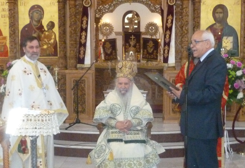 Στο τέλος της Θείας Λειτουργίας ο Πρόεδρος της Κοινότητας κ. Παντελής Δημοσθένους, αφού προσφώνησε καταλλήλως τον Σεβ. Αρχιεπίσκοπο, του προσέφερε, εκ μέρους των Αρχόντων και του λαού της τοπικής Κοινότητας, τιμητική πλακέτα, με την ευκαιρία της συμπληρώσεως 25 χρόνων από της αναλήψεως των Αρχιεπισκοπικών του καθηκόντων, στην ιστορική αυτή Επαρχία του σεπτού Οικουμενικού θρόνου της Κωνσταντινουπόλεως.