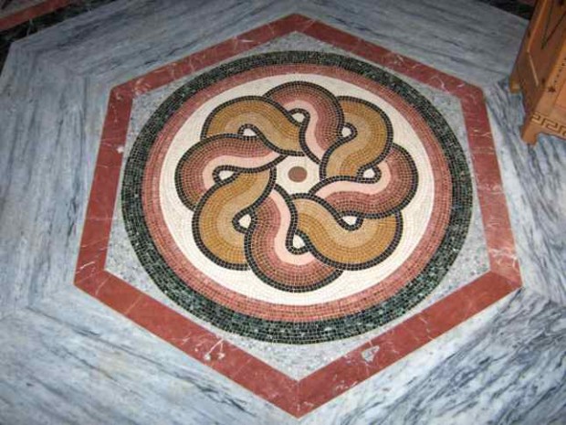 Τo αριστουργηματικά μαρμάρινο δάπεδο του Ναού (1997-1998) είναι έργο του Μοναχού Ιωσήφ, με ακριβέστατα γεωμετρικά ψηφιδωτά. Οι παραστάσεις που απεικονίζονται είναι: στο κέντρο υπάρχει ένθετη μία πέτρα από το όρος Σινά, ώστε ο τόπος να είναι τόπος Σινά – τόπος προσευχής. Γύρω, υπάρχει αριστοτεχνικός πλοχμός, αρχαίο σχέδιο, με χρωματικές επιλογές που παραπέμπουν στις φυλές των ανθρώπων και την ευκτέα αγάπη και ομόνοια αυτών. Στις γωνίες του δαπέδου, απεικονίζονται τέσσερα δελφίνια, θαυματουργικώς παρόντα σε βίους Αγίων. Επίσης, υπάρχει η επιγραφή, μία λέξη πλάϊ σε κάθε δελφίνι· Ιωσήφ αιτεί έλεος, 1997, μία αιώνια παράκληση.
