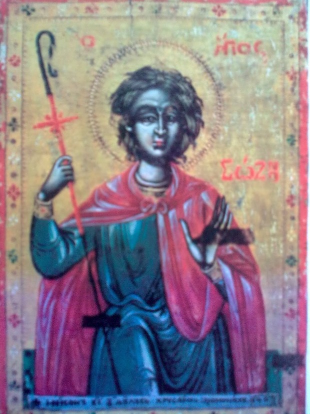 Δι’ ὄμφης οὐρανίου πιστωθεῖς πρὸς τὰ κρείττονα, τοὺς τῆς εὐσέβειας ἀγῶνας, ἄπτοητως διέδραμες· καὶ ὤφθης τοῦ Σωτῆρος κοινωνός, ἀθλήσας Μάρτυς Σῴζων ἄνδρικως· διὰ τοῦτο διασῴζεις ἐκ πειρασμῶν, τοὺς πίστει προσιόντας σοί. Δόξα τῷ παρασχόντι σοὶ ἴσχυν, δόξα τῷ σὲ στεφανώσαντι, δόξα τῷ ἔνεργουντι διὰ σοῦ πάσιν ἰάματα.
