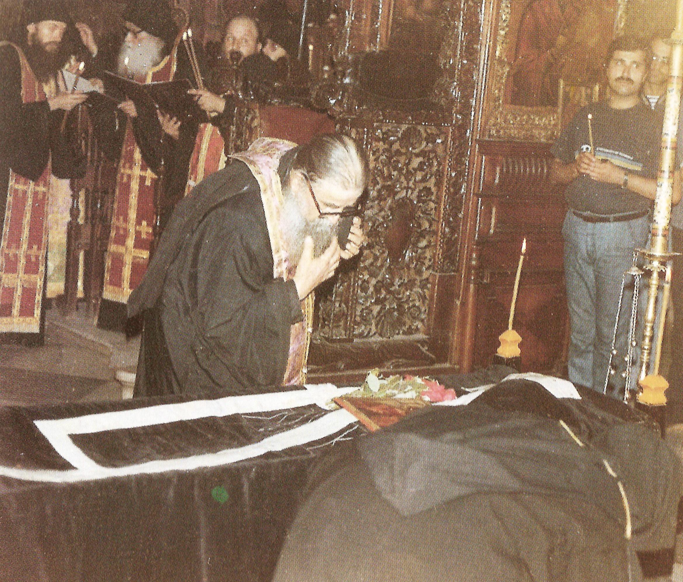 Ο Πανοσιολιώτατος Αρχιμανδρίτης κ. Χαράλαμπος (ηγούμενος τότε) της Ιεράς Μονής Αγίου Διονυσίου δίνει κατά την διάρκεια της κηδείας τον τελευταίο ασπασμό στον μακαριστό Γέροντα Αρσένιο.