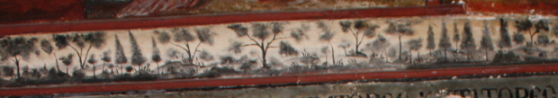 Διαχωριστική επιζωγραφισμένη ταινία σε άσπρο φόντο στο πάνω μέρος διαχωρίζει αυτήν την τοιχογραφία από τις υψηλότερες. Η ταινία απεικονίζει ένα ήρεμο και πλούσιο φυσικό τοπίο, μάλλον το αγιορείτικο.