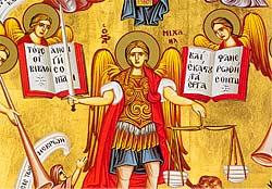 4.Başmelek Mikail’in sağındaki ve solundaki trompet çalan melekler,dünyaya İsa Mesih’in dönüşünü,Son Yargı’nın başlayışını ilan edip,ölülerin dirilişinin işaretini vermektedirler.