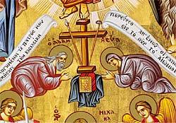 1. Mesih,solda Theotokos (Tanrı Doğuran-Meryem Ana) ve sağ tarafında Vaftizci Yahya olmak üzere ortada bir tahtta oturmaktadır. Küçük tahtlarda oturanlar ise havariler olup;solda Aziz Petrus ve sağ tarafta Aziz Pavlus olmak üzere temsil edilmişlerdir.