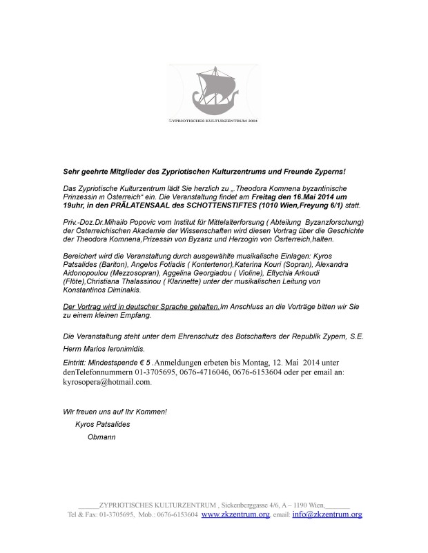 Das Zypriotische Kulturzentrum lädt Sie herzlich zu „.Theodora Komnena byzantinische Prinzessin ιn Österreich“ ein. 3 Μαΐου 2014 Zypriotisches Kulturzentrum – Einladung Tags:Das Zypriotische Kulturzentrum lädt Sie herzlich zu „.Theodora Komnena byzantinische Prinzessin ιn Österreich“ ein.