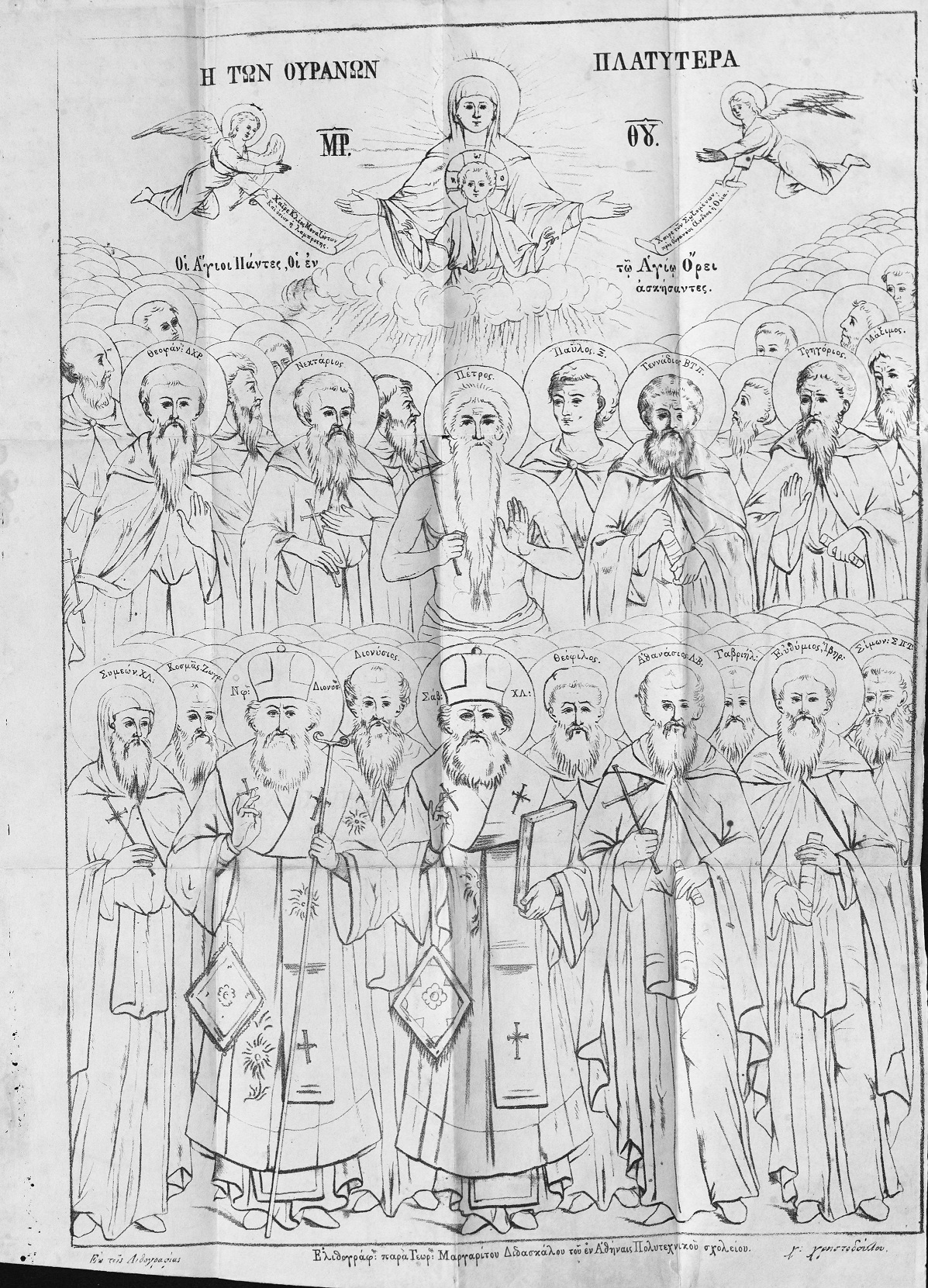 Γενική άποψη του Aγίου Όρους με τα καθιδρύματα,απόστολοι, αρχάγγελοι, μοναχοί και άγιοι (χείρ Γενναδίου Mοναχού) – 1859 μ.Χ. – Pουμανική Σκήτη Tιμίου Προδρόμου, Άγιον Όρος