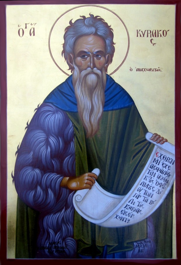 Χριστῷ ἠκολούθησας, καταλιπῶν τὰ τῆς γῆς, καὶ βίον ἰσάγγελον, ἐπολιτεύσω σαφῶς, ὡς ἄσαρκος Ὅσιε, σὺ γὰρ ἐν ταὶς ἐρήμοις, προσχωρῶν θείω πόθω, σκίλλη πίκρα τὴν πάλαι, πικρᾶν γεῦσιν ἀπώσω. Διὸ Κυριακὲ θεοφόρε, ἀξίως δεδόξασαι.