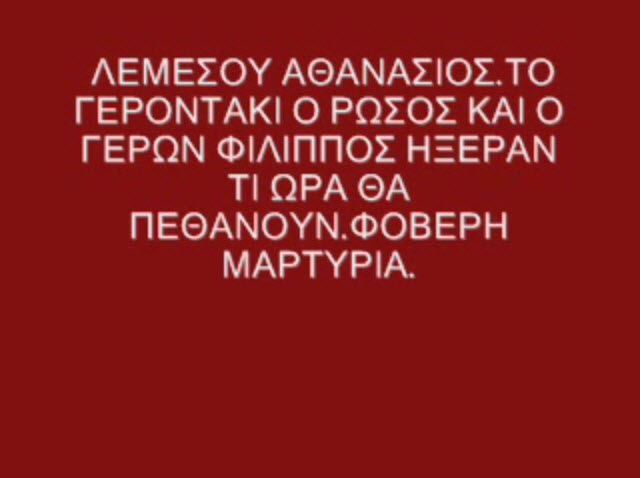 Λεμεσού Αθανάσιος.Το γεροντάκι ο Ρώσος και ο Γέρων Φίλιππος ήξεραν τι ώρα θα πεθάνουν.Φοβερή μαρτυρία. Πηγή: apantaortodoxias.blogspot.gr Tags:γεροντάκι ο ΡώσοςΓέρων ΦίλιπποςΛεμεσού Αθανάσιοςμαρτυρία