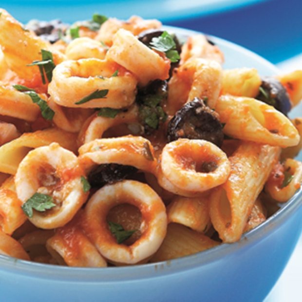 Πένες με καλαμαράκια, ελιές, λιαστή ντομάτα και βασιλικό