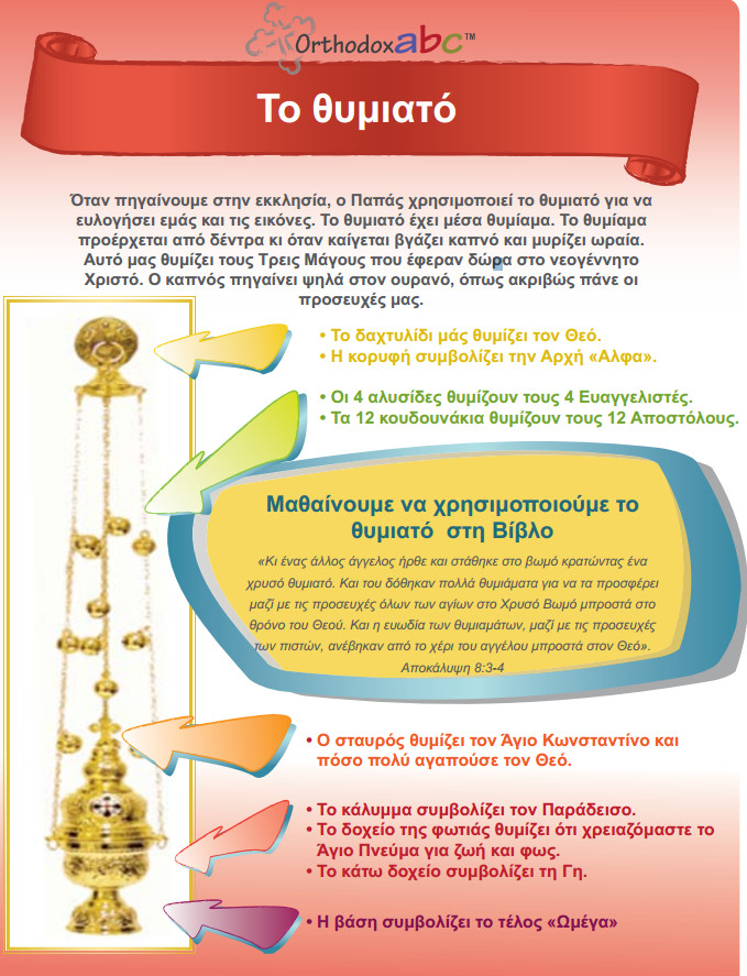 Τα θυμιατά που χρησιμοποιούμε στους Ιερούς Ναούς είναι κινητά μεταλλικά σκεύη που στο κάτω μέρος δέχονται τα αναμμένα κάρβουνα ή καρβουνόσκονη. Εξαρτώνται από τέσσερις αλυσίδες με δώδεκα κουδουνάκια. Συμβολίζουν τους τέσσερις Ευαγγελιστές και τους δώδεκα Αποστόλους αντίστοιχα. Η βάση του θυμιατού συμβολίζει την ανθρώπινη φύση του Χριστού μέσα στα σπλάχνα της Παναγίας Μητέρας Του. Τα ανάμενα κάρβουνα συμβολίζουν το πυρ της θεότητας. Είναι η βάτος η φλεγόμενη αλλά μη κατακαιομένη. Η φωτιά συμβολίζει και τη Θεία Αγάπη που ως φωτιά καίει την καρδιά του κάθε πιστού.