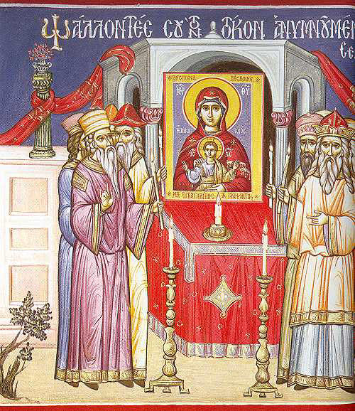 Ύμνοις εν αΰπνοις οι ευσεβείς, ακαθίστω στάσει, ανυμνούμεν πανευλαβώς, την προς τον λαόν σου, θερμήν σου προστασίαν, Παρθένε Θεοτόκε, ημών βοήθεια.