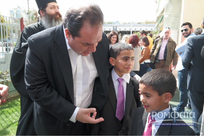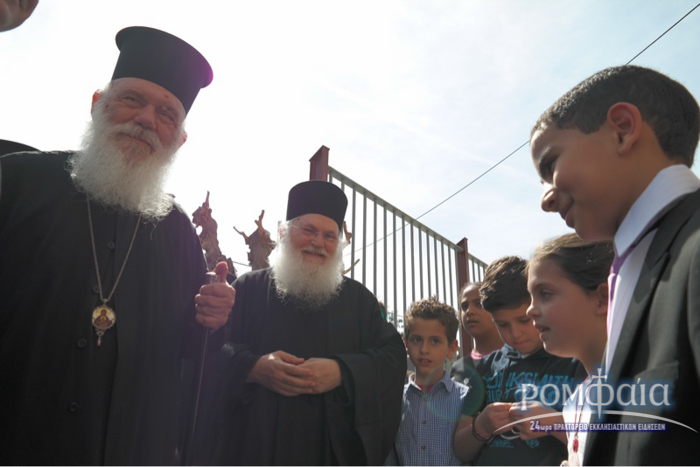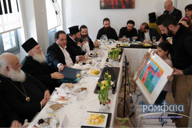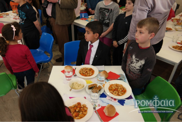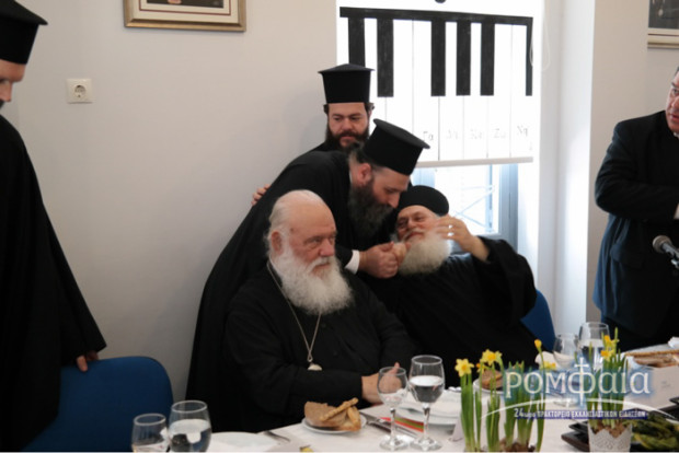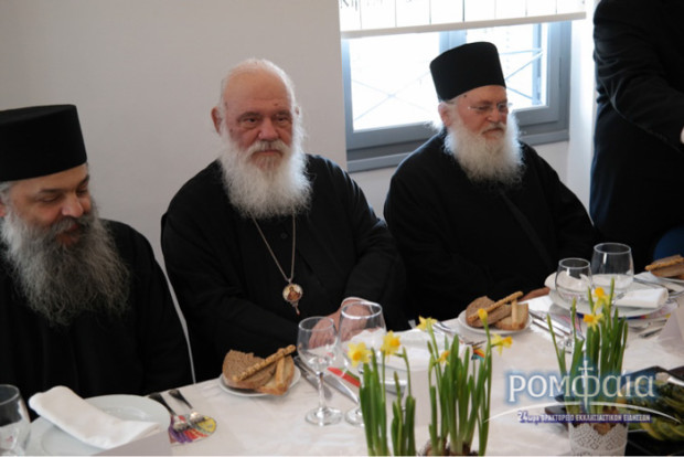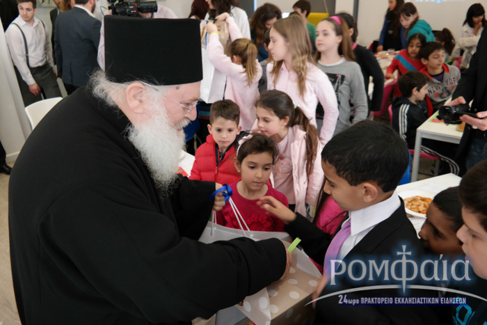 Ο ηγούμενος Εφραίμ, μαζί με τον Μακαριώτατο Αρχιεπισκόπο Αθηνών και πάσης Ελλάδος κ.κ. Ιερώνυμο, τον Μητροπολίτη Ιωαννίνων Μάξιμο, τον Μητροπολίτη Νέας Ιωνίας και Φιλαδελφείας Γαβριήλ, τον Πρωτοσύγκελο της Αρχιεπισκοπής Αθηνών Αρχιμ. Συμεών Βολιώτη, τον Πρωτοσύγκελο Νέας Ιωνίας και Φιλαδελφείας Αρχιμ. Επιφάνιο Αρβανίτη, μοναχούς της Μονής Βατοπαιδίου και ο Γενικός Διευθυντής της Αποστολής κ. Κωνσταντίνος Δήμτσας παρακάθισαν σε γεύμα μαζί με τα παιδιά.