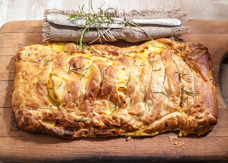 Ψήνουμε σε προθερμασμένο φούρνο στους 180 C για 40-45 λεπτά μέχρι να έχουν γίνει οι πατάτες, να φουσκώσει η σφολιάτα και να έχει πάρει χρώμα.