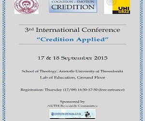 Το Τμήμα Θεολογίας του Αριστοτελείου Πανεπιστημίου Θεσσαλονίκης σε συνεργασία με το Τμήμα Θεολογίας του Πανεπιστημίου Graz της Αυστρίας διοργανώνουν Διεθνές Συνέδριο στη Θεσσαλονίκη, στις 17 και 18 Σεπτεμβρίου 2015. Το Συνέδριο είναι αφιερωμένο στη μελέτη της «Credition», που προέρχεται από τη σύνθεση των λέξεων credence + cognition = πίστη + νόηση, και είναι ένας νέος όρος που περιγράφει τις ενέργειες του ατόμου οι οποίες σχετίζονται με αυτό που αναφέρεται ως «πιστεύω». Οι creditions γίνονται αντιληπτές ως βασικές διαδικασίες οι οποίες σχετίζονται τόσο με την αποθήκευση γεγονότων και γνώσεων στον εγκέφαλο όσο και με ψυχολογικές λειτουργίες όπως το συναίσθημα και η νόηση οι οποίες ανήκουν στις γνωσιακές νευροεπιστήμες. Το 3ο διεθνές συνέδριο “Credition Applied" στοχεύει στην προώθηση της ερευνητικής εφαρμογής των creditions –ως ...