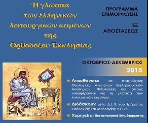 Η γλώσσα των λειτουργικών κειμένων Πρόγραμμα Εξ αποστάσεως Επιμόρφωσης Δεύτερος κύκλος Μετά την ευρεία αποδοχή και την επιτυχή ολοκλήρωση του πρώτου κύκλου λειτουργίας, θα επαναληφθεί για δεύτερη φορά κατά το χειμερινό εξάμηνο του ακαδημαϊκού έτους 2015 (Οκτώβριος 2015 – Ιανουάριος 2016) το εξ αποστάσεως Πρόγραμμα που αφορά τη «Γλώσσα των ελληνικών λειτουργικών κειμένων της Ορθοδόξου Εκκλησίας». Το πρόγραμμα υλοποιείται στο πλαίσιο των προγραμμάτων Δια Βίου Μάθησης από το Αριστοτέλειο Πανεπιστήμιο Θεσσαλονίκης. Απευθύνεται σε κληρικούς και λαϊκούς και στοχεύει, μέσω της κατάκτησης βασικών γνώσεων γραμματικής, συντακτικού και λεξιλογίου, να τους καταστήσει ικανούς να κατανοούν τα πρωτότυπα λειτουργικά κείμενα. Η καινοτομία του προγράμματος έγκειται στον τρόπο υλοποίησής του. Στηρίζεται αποκλειστικά στην εξ αποστάσεως διδασκαλία. Με τον τρόπο αυτό παρέχεται δυνατότητα συμμετοχής ακόμη και σε εκείνους που είναι ...