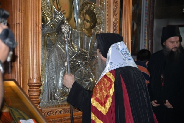 Μετά την υποδοχή η Ιερά Εικόνα μετεφέρθη λιτανευτικά στο Καθολικό, όπου ετελέσθη Δοξολογία, χοροστατούντος του Σεβασμιωτάτου Μητροπολίτου Πατρών κ.κ. Χρυσοστόμου.