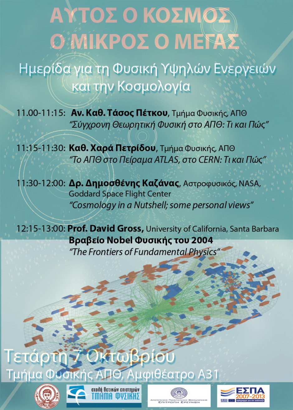 Την Τετάρτη 7 Οκτωβρίου 2015, μια ευχάριστη έκπληξη περιμένει τους φοιτητές του Τμήματος Φυσικής του ΑΠΘ. Ο καθηγητής David Gross (University of California, Santa Barbara), βραβείο Nobel Φυσικής του 2004, θα βρίσκεται στα αμφιθέατρά τους, στα ίδια αμφιθέατρα όπου παρακολουθούν καθημερινά τα μαθήματά τους. Η ομιλία του καθηγητή Gross, με θέμα “The Frontiers of Fundamental Physics”, εντάσσεται στο πλαίσιο της Ημερίδας για την Φυσική των Υψηλών Ενεργειών και την Κοσμολογία που διοργανώνεται από τον Τομέα Πυρηνικής Φυσικής και Στοιχειωδών Σωματιδίων του Τμήματος Φυσικής του Α.Π.Θ. Την κοσμολογική πλευρά της ημερίδας θα καλύψει ο Έλληνας αστροφυσικός Δημοσθένης Καζάνας (NASA, Goddard Space Flight Center), αντεπιστέλλον μέλος της Ακαδημίας Αθηνών. Δραστηριότητες του ΑΠΘ στην Φυσική Υψηλών Ενεργειών και την Κοσμολογία θα παρουσιάσουν τα μέλη ΔΕΠ του Τομέα. Ομιλητές: Τάσος Πέτκου, Αν. ...