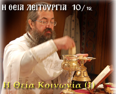Σ' αυτό το σημείο συνήθως κλείνει το καταπέτασμα της Ωραίας Πύλης και προετοιμάζεται η Θεία Κοινωνία των ιερέων και των πιστών. Κατά τη διάρκειά της ψάλλεται το Κοινωνικό, που περιλαμβάνει στίχους από κάποιους ψαλμούς, άλλους για τις Κυριακές και άλλους για κάθε εορτή. Αμέσως μετά κοινωνεί πρώτα από τη μερίδα ΧΣ του Σώματος και έπειτα από το Αίμα τρεις φορές. Ο ιερέας κοινωνεί τον διάκονο. Αν υπάρχουν κι άλλοι ιερείς κοινωνούν με τον ίδιο τρόπο, αφού φορέσουν το επιτραχήλι τους. Ύστερα ο ιερέας ρίχνει στο Άγιο Ποτήριο και τις υπόλοιπες μερίδες του Σώματος και περισυλλέγει τους μαργαρίτες (ψιχουλάκια) που έχουν πέσει στο ειλητό με ευλάβεια και πολλή προσοχή λέγοντας την προσευχή “Ἀνάστασιν Χριστού θεασάμενοι...”. Τέλος με το Άγιο Ποτήριο σκεπασμένο και υψωμένο βγαίνει ...