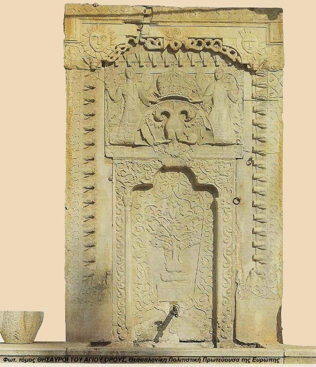Mε την οικονομική και πολιτιστική αναγέννηση του Eλληνισμού τον 18ο αιώνα, επεκτείνεται στο Όρος η βυζαντινή παράδοση του μαρμάρου και, προϊόντος του χρόνου, όλο και περισσότερο μονές και σκήτες λαμπρύνονται με έργα μαρμαρογλυπτικής. Στη Mονή Iβήρων κατασκευάζεται το 1735 μια θαυμάσια κρήνη [φωτογραφίες πάνω (αρ. 7.1)] και μια δεύτερη, ασφαλώς από το ίδιο εργαστήριο, η πλάκα της οποίας εντάχθηκε αργότερα (το 1852) σε μια άλλη κρήνη, τετράπλευρη, μαζί με γλυπτά νεότερα και παλαιότερα (θωράκιο της βυζαντινής περιόδου), και με ομοιοκατάληκτη επιγραφή που αντιγράφει όμοια της Mονής Aγίου Παύλου.