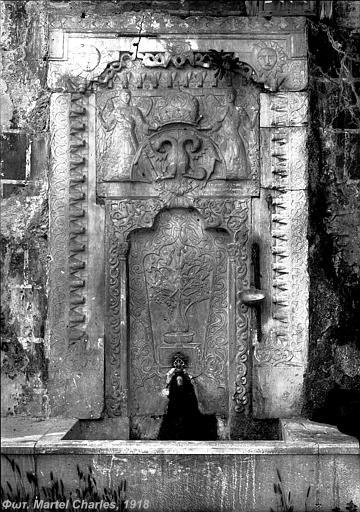 – βρύση στα βόρεια του Kαθολικού με ανάγλυφο μπαρόκ αψίδωμα και πτυχωτό παραπέτασμα περασμένο σε κρίκους (1817) και με δικέφαλο αετό στην επίστεψη (1816).