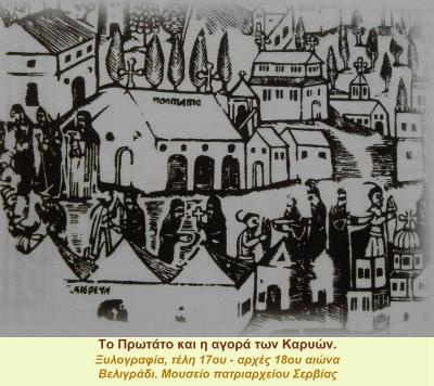 Καταστήματα στον προαύλιο χώρο του Ιερού Ναού του Πρωτάτου, τα οποία σχεδόν εφάπτονταν του καμπαναριού και αποτελούσαν την κεντρική αγορά των Καρυών, μας δίνουν μια εντελώς διαφορετική εικόνα της πρωτεύουσας του Αγίου Όρους στα μέσα του 19ου αιώνα. Το σχέδιο είναι από το αρχείο του Παύλου Μυλωνά. Εκτέθηκε σε Έκθεση της Αγιορειτικής Εστίας και ανήκε στη συλλογή του επισκόπου Πορφυρίου Ουσπένσκι (1804-1885).
