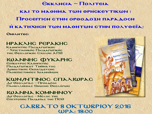 Η Ιερά Μητρόπολη Μυτιλήνης, η Πανελλήνια Ένωση Θεολόγων, η Ένωση Θεολόγων Λέσβου και το Εργαστήριο Παιδαγωγικής – Χριστιανικής Παιδαγωγικής του Τμήματος Ποιμαντικής και Κοινωνικής Θεολογίας της Θεολογικής Σχολής του ΑΠΘ, ανταποκρινόμενοι στην απαίτηση πολλών γονέων και συμπολιτών μας, για αντίδραση πάνω στην κλιμακούμενη αποδόμηση του μαθήματος των Θρησκευτικών, διοργανώνουν ημιημερίδα με θέμα: Εκκλησία – Πολιτεία και το μάθημα των Θρησκευτικών: Προσέγγιση στην ορθόδοξη παράδοση ή κατήχηση των μαθητών στην πολυθεΐα; Η Ημιημερίδα απευθύνεται σε εκπαιδευτικούς, σε γονείς και κηδεμόνες μαθητών, σε κληρικούς και σε κάθε ενδιαφερόμενο. Η εκδήλωση θα πραγματοποιηθεί το Σάββατο 8 Οκτωβρίου 2016 και ώρα 18:00, στην Αίθουσα Εκδηλώσεων του Πειραματικού Γενικού Λυκείου Μυτιλήνης του Πανεπιστημίου Αιγαίου (Κεντρικά Λύκεια). Το πρόγραμμα της ημιημερίδας: Πρόεδρος: Παναγιώτης Τσαγκάρης, Mr Θεολογίας, Γενικός Γραμματέας Πανελλήνιας Ένωσης Θεολόγων 18:00 – ...
